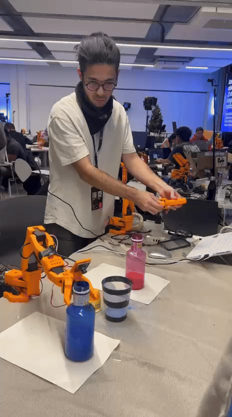 With the OS fixed, it was time for data collection. Imitation learning was the key. The organizers supplied two So-101 robotic arms. A "leader" arm setup allowed manual control of the "follower" arm, recording the precise movements for the dataset.