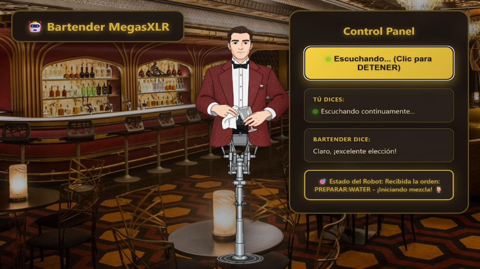 Pele worked on integrating the UI with the robot logic. This is where the LLM came in. Gemini (thankfully on free credits) powered the bartender's brain. The model was instructed to adopt a specific persona: talk and act exactly like a real bartender, cracking jokes and keeping the conversation flowing while taking orders.
