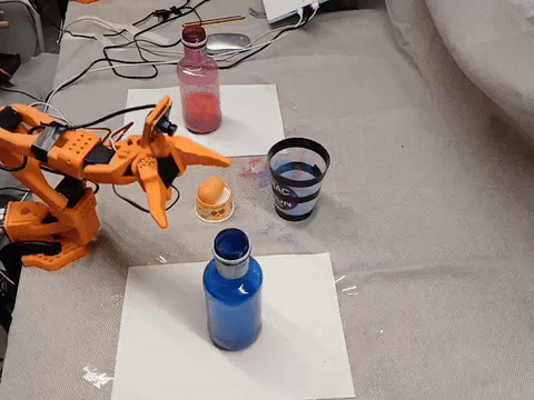 I also tried to put an orange object in the drink (actually a yellow Kinder egg container), attempting to transfer-learn the blue bottle model with a small dataset of the orange object. However, it was quite laggy, so that feature was scrapped to keep the demo smooth.